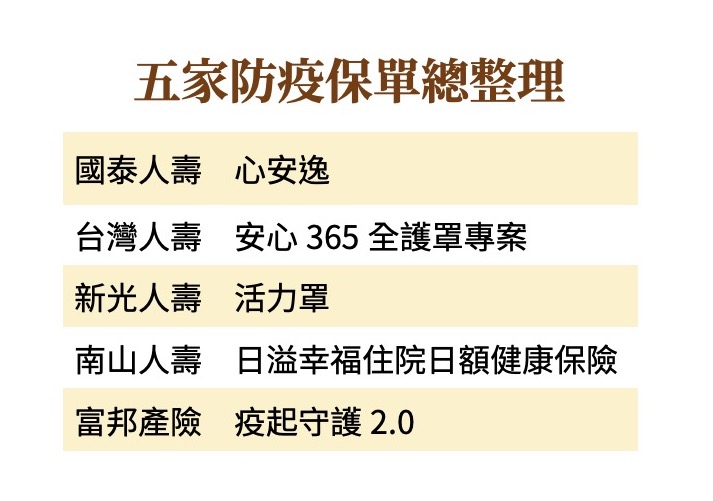 這次整理了「國泰人壽 心安疫」、「富邦產險 疫起守護2.0」、「新光人壽 活力罩」、「台灣人壽 安心365全護罩」、「南山人壽 日溢幸福住院日額健康保險」五間保險公司的防疫保單。